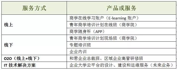 和君商学业务聚焦于管理培训和商学学习,以线下面授培训、线上网络培训相结合的O2O模式,以企业家和企业高管培训、企业人才培训、企业管理内训、高等院校从商毕业生的就业和创业能力培训为主营业务,逐步开发建设基于移动互联网和大数据的技术平台运营系统,为企业和个人的商学学习提供O2O服务。