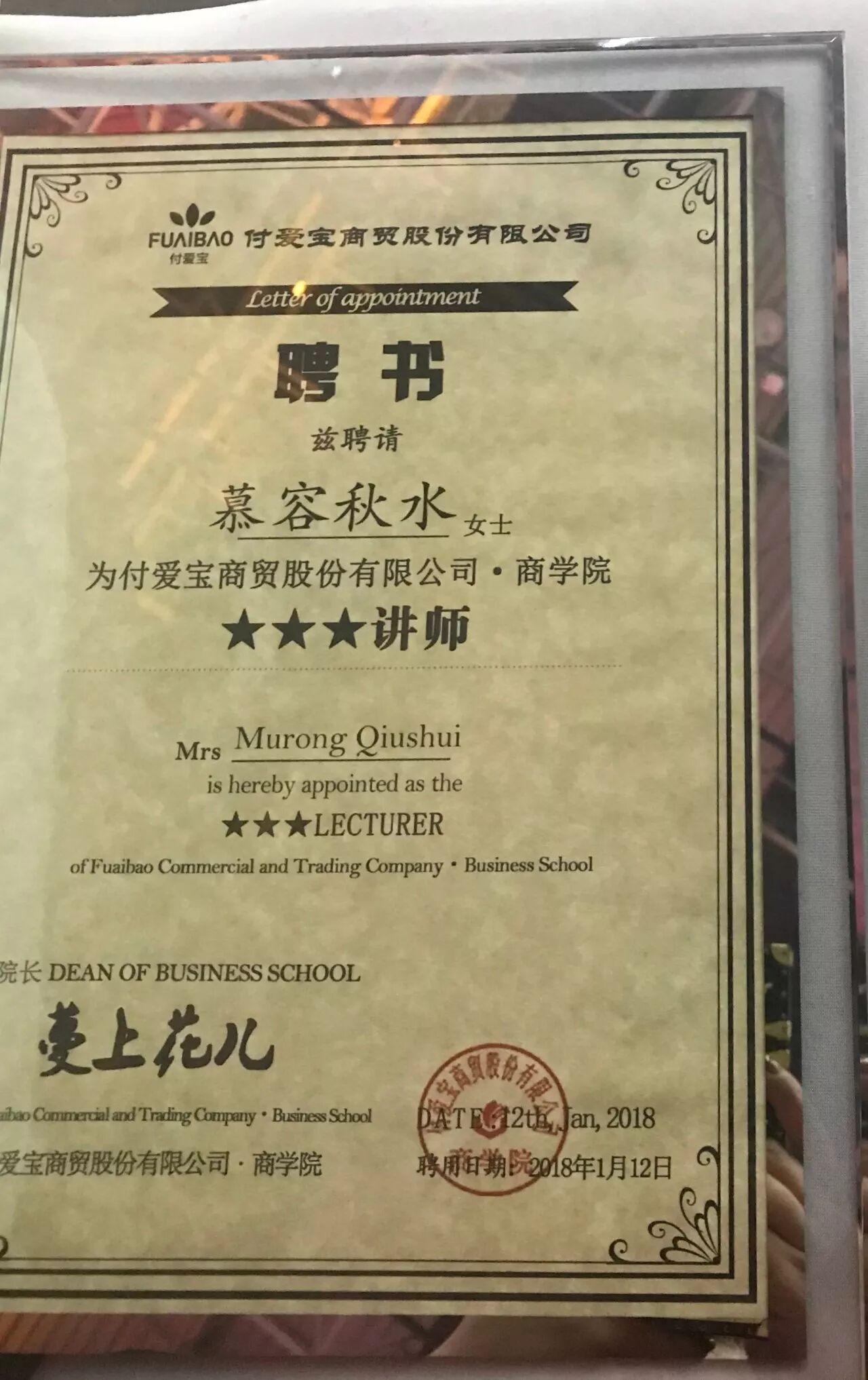 因为有梦,所以奋斗;因为付爱宝,所以成就现在的我。我会为我当初选择的“跑道”去冲刺,坚定的信念将会一直陪伴着我努力的奔跑。有付爱宝这个坚实的后盾,我相信我能持续不断的收获人生的硕果,品味人生的快乐。