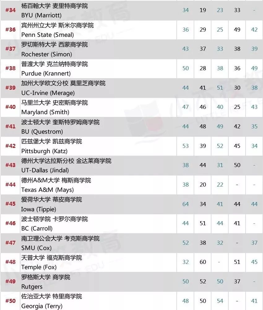 之后是上升了21个位置的 福特汉姆大学 加贝利商学院 Fordham (Gabelli),该校从去年的第83名跃升为第62名。而 罗格斯大学 商学院 Rutgers 也上升了18个位次,从去年的第67名排到了今年的第49名。