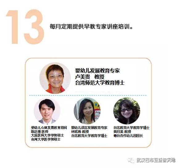 1) 与国际接轨:来自台湾三大权威教育专家联合制定,根据不同年龄段设计的家庭幼教体系,以品格教育为主轴,全面发展幼儿的心智与能力。
