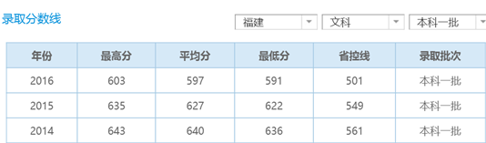 (由上至下分别是2016-2014年的福建省文科本一批录取分数线)