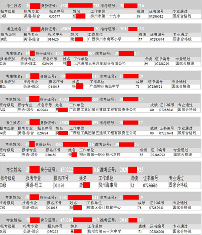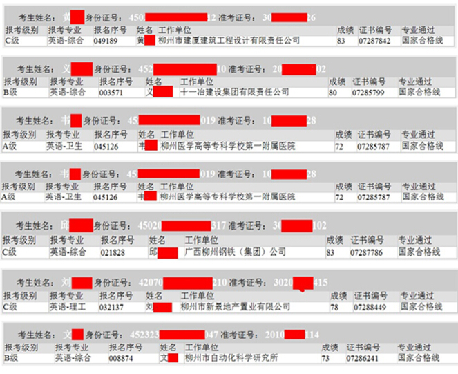 部分同学的网上查询成绩单(柳州地区)