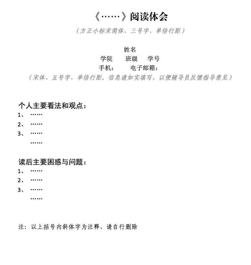 其中,2本精读书目的读书报告正文每篇不少于2000字,并要求在正文之外整理归纳个人观点和读后困惑。3本泛读书目的读书报告仅需归纳个人观点及读书困惑,字数不限。
