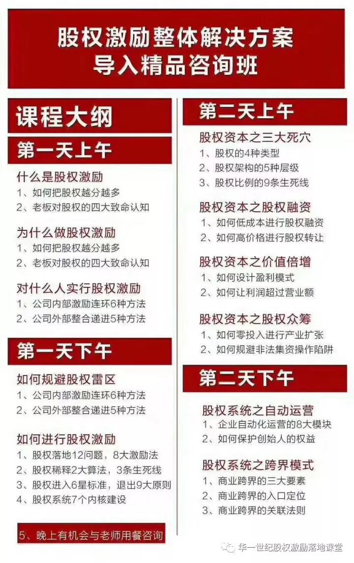 2014年9月,华一世纪联合多名专家学者共同发起成立了全国首家专注股权激励研究的专业机构——中国股权激励研究院,为同行业、同区域、同规模的企业开发出更细致、更具针对性的股权激励培训方案。