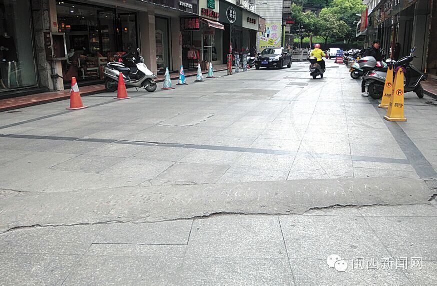 在新罗区女人街上,也有连续两处使用水泥砌成的减速带。记者来到这里时看到,这两处减速带的高度也不小,且宽度较大(图2)。网友纷纷吐槽,即便是要起到减速作用,也不需要如此“庞大”的减速带。记者在现场看到,不少经过的踏板摩托车尽管已使用低速通过,仍然会不小心磕到车底。