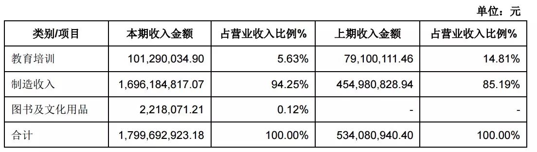 其中,制造收入16.96亿元,占营收94.25%;教育培训收入1.01亿元,占营收5.63%;图书及文化用品收入221.80万元,占营收0.12%。制造收入为汇冠股份及其控股、参股企业主要业务。