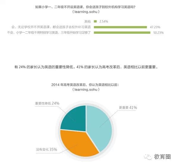 2014年搜狐教育年度消费调查发现,有5成的家长认为小学一二年级不用特别学习英语,三年级开始学习足够了。