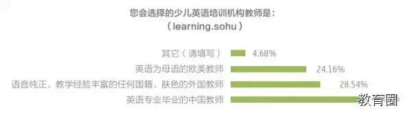 在对少儿英语培训班的师资选择上,选择“英语为母语的欧美教师”的家长仅为24%,更多的家长选择“英语专业毕业的中国教师”(42%),其次是“语音 纯正、教学经验丰富的任何国籍、肤色的外国教师”(28%),由此看来,家长更喜欢能跟孩子互动、能调动气氛、有教学经验的老师,而并不特别在意是否是欧 美老师。