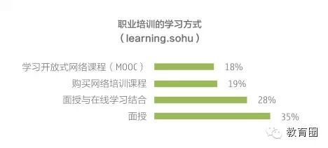 此数据也与搜狐教育调查中显示的学习者在线学习方式比例增加相吻合。调查显示37%的人通过不同平台在线学习(MOOC学习占18%、购买网络培训课占19%),这与35%的人接受面授的传统方式基本持平。