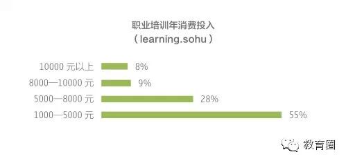 调查显示,今年参与职业培训投入在1000-5000元的用户占到了55%,投入在5000-8000元的为28%(相比去年的45%有所下降),投入在10000元以上的人仅为8%。