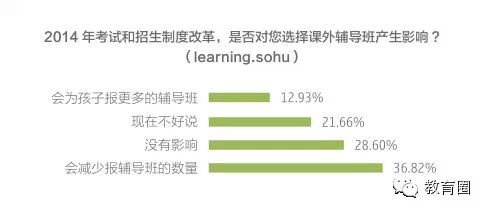 新的改革方案到底是“减负”还是“增负”?据2014年搜狐教育消费者调查显示,投票排行第一的是 “会减少报辅导班的数量”(36.82%);28.6%的网友认为新方案对既定的报班计划没有影响,此外,还有12.93%的网友表示“会为孩子报更多辅导班”。