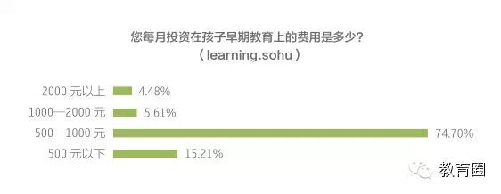 2014年搜狐教育年度消费者调查显示,74.7%的家庭每月在孩子早期教育上的投入为500-1000元,10.09%的家庭每月的投入在1000元以上。可见,家长愿意投入一定的花费对孩子进行早期教育。