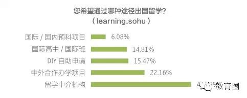 搜狐教育的调查显示,在自费出国留学人员中,通过留学中介机构办理出国的人数仍占近半江山(41.48%),通过大学阶段中外合作办学/交换项目出国留 学的人员达22.16%。其它方式依次是DIY申请(15.47%)、国际高中/国际班(14.81%)、国际/国内预科项目(6.08%)。国际高中、 国际预科的出现,使得中国学生留学方式日益多元。