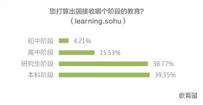 据2014年搜狐教育年度消费调查,39.55%的人选择出国读本科,超过出国读研的人数(38.77%),有15.53%的人选择出国读高中,4.21%的人希望出国读初中。不过,虽然低龄化趋势日益增长,出国读本科的人群仍占主体部分。