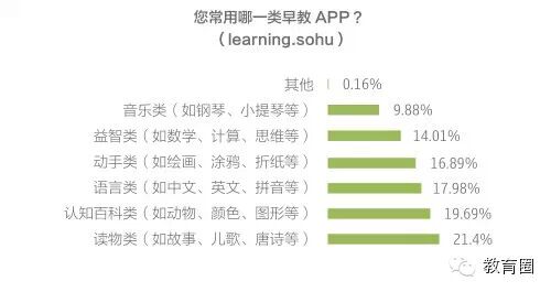 在针对家长使用的早教App种类的调查中,2014搜狐教育消费者调查发现,在琳琅满目的早教App中,故事、儿歌等读物类最受家长青睐,比例达到 21.4%;其次是认知百科类,占19.69%;其他依次为语言类(17.98%)、动手类(16.89%)、益智类(14.01%)和音乐类 (9.88%)。
