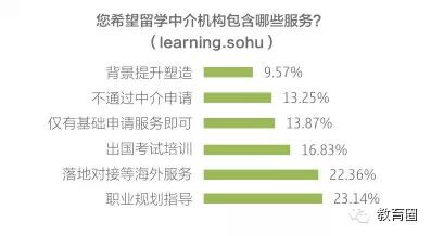 随着留学中介的增多,用户对其提供的服务也有了更多的需求,单一的申请服务已不能满足。并且这一需求主要体现在留学后的阶段,23.14%的调查者表示 希望可以包含职业规划方面的指导;22.36%的人希望中介机构能提供学生落地后的对接服务。在留学前,学生的需求主要集中在出国考试培训 (16.83%)、背景提升塑造(9.57%)。仅有13.87%的人表示留学中介只包含基础申请服务即可。