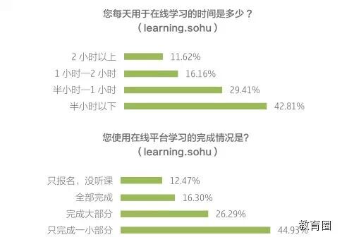2014年搜狐教育年度消费者调查报告显示,42%的人每天在线学习时间不超过半小时,学习时间超过2小时的人只占到11%。