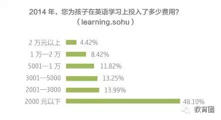 从全国来看,近5成(48%)的家长今年为孩子在英语学习上投入的费用为2000元以下。从此次参与调查的用户上分析,选择2000元以下的,多为二三线城市网友,而选择5001-1万元的,北上广的网友则相对较多。