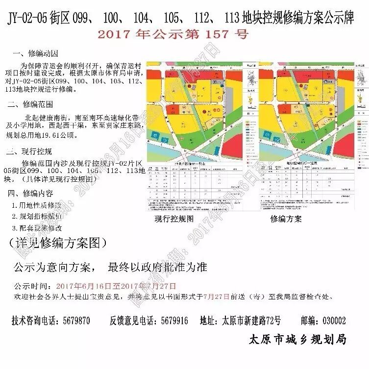 为保障青运会的顺利召开,确保青运村项目按时建设完成,根据太原市体育局申请,对JY-02-05街区099、100、104、105、112、113地块控规进行修编,修编范围:北起健康南街,南至南环高速绿化带及小学用地,西起西干渠,东至贾家庄东路,规划总用地19.61公顷。