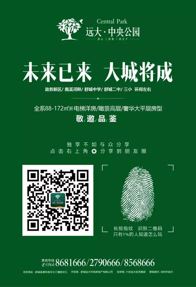 远大·中央公园2017年匠心打造全系88~172㎡电梯洋房、瞰景高层、奢华大平层美宅,项目内置50000㎡社区公园,与南溪河公园交相辉映,为舒城人民打造一座属于自己的世界级公园之城!目前首期正在火爆预约登记中!