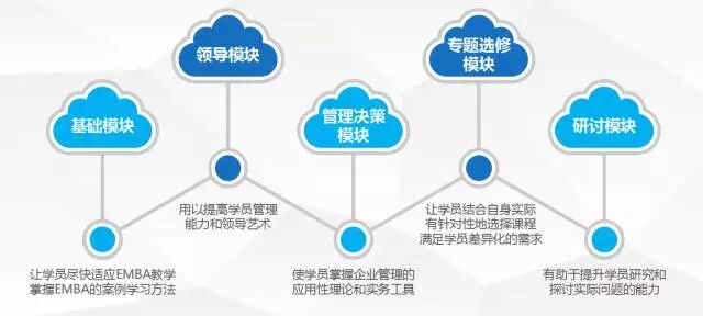 首创国内EMBA+1 办学模式,即:除规定必修课外,根据当前热点设立不同选修方向。特色选修课程,哈佛商学院公选课、人文素养公选课