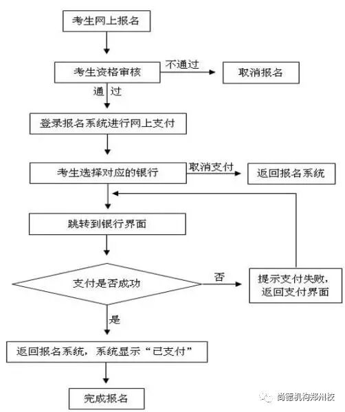 考生从报名网站首页(www.ntce.cn)“在线报名(河南)”入口点击进入报名登录页面→注册取得登录密码(帐号为本人姓名及身份证号)→登录网上报名系统→笔试报名→选择考区→选择类别→选择科目→完成网上填报报名信息→等待网上审核→审核通过考生再次登录网上报名系统在线支付考试费(完成笔试报名确认)→安全退出。