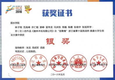 ②“创青春”浙江省第十届挑战杯·奥康大学生创业大赛银奖