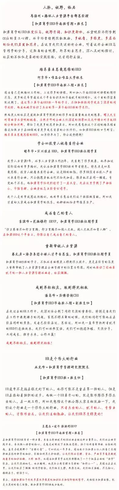 和君人认为,当HR发展到了部长、总监、副总裁的职业阶段,困扰他们的已不再是HR领域的专业知识,而是能不能跳出专业深井,以总裁思维来看待问题和解决问题。一个真正到位的HRVP、HRD,谈的从来都不是HR问题,而就是业务问题,只不过他是从组织的角度、人的角度去解决问题,而决定这个HR高管职业段位的,也绝不是HR能力,而是他对战略及企业本质问题的理解力。因此,如果要说和君商学HRD班与其他HRD班有什么不同,始自它的定位和理念——培养最具总裁思维的人力资源高管。并在此之下,对知识结构、课程和师资,重新进行设计和安排,不是就HR谈HR,而是提升认知维度,打开思维空间。幸运的是,我们以这样的想法走过两年,华南班、华北班,然后是华东,得到了同学们的肯定,且学员极为优秀。当2017年下半年伊始,我们就开始筹备西南区HRD班,我们希望能和全国所有的同学们约定“和君同学情,江湖不相忘”。和君集团合伙人、名师