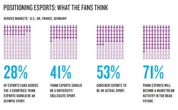 尼尔森的调查显示电竞粉丝对电竞的未来充满信心:28%的粉丝认为电竞应该成为一项奥运会比赛项目,41%认为电竞应该作为大学运动,53%认为电竞是一项真正的体育运动,71%认为不久的将来电竞会成为一个主流的活动。调查人群的国家:美国、英国、法国和德国。(图片来源:SoccerexPro)