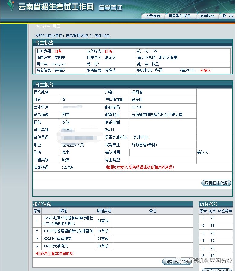 编辑个人基本信息、选择对应专业。13位考号不用填写。