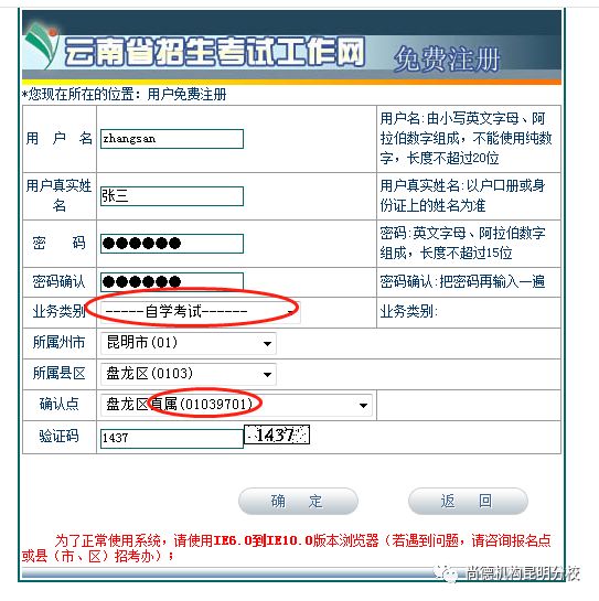 注意:1.业务类别选择:“自学考试” 2.这个步骤所属州市和所属县区,是填你现在要考试的区域,后面填写个人资料是才需要填身份证上面的地址的。填写确认点:是直属,如:盘龙区直属、五华区直属。密码设定123456.忘记很麻烦。