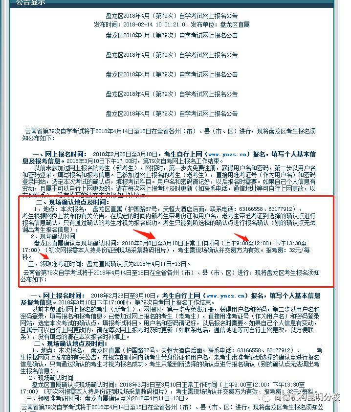 2018年4月云南省高等教育自学考试将在4月14—15日进行,网上报名是2月26日至3月10日,今天开始通知: