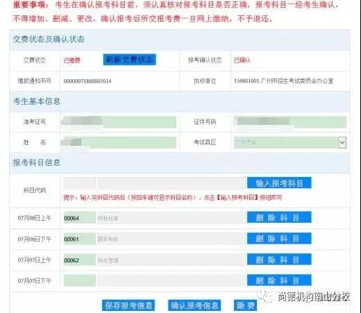 自2018年4月份自学考试报考开始,所有考生须通过广东省自学考试管理系统(www.stegd.edu.cn/selfec/)报考各专业课程,并且实行网上缴费,原5184、96040电话报考通道停止使用。考生在确认报考课程前,须认真核对报考课程是否正确,报考课程一经考生确认,不得增加、删减、更改,确认报考后所交报考费一旦网上缴纳,不予退还。