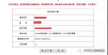 考生要再次核对个人身份信息、报考科目是否与个人所选一致、订单金额是否有误,若无误,点击“前往缴费”按钮(见图5),并在弹出的身份确认信息框(温馨提示),请输入考生在广东省自学考试管理系统中的考生证件号码(所输入证件号码务必于系统中信息完全一致,见图6)。