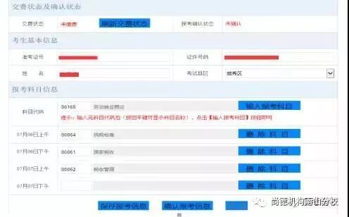 考生根据自身情况选择考试县区,因部分县区考场紧张,若报考较晚可能会导致在该县区无法报考,考生可选择在其他县区报考。在“报考科目信息”栏按照提示输入科目代码,点击“输入报考科目”按钮即可选择该报考科目,系统会根据开考时间安排,自动将报考科目填入对应时间节点。考生在未确认报考前可以通过点击“保存报考信息”按钮保存当前填报的科目,也可随时点击“删除科目”按钮删除该按钮前对应的已选课程(见图4)。