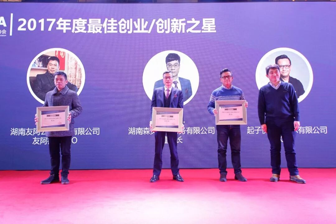 祝贺友阿云商副总经理曹磊、森贝全球购总裁廖浩科、起子侠CEO陈昉荣获2017年度最佳创业/创新之星。