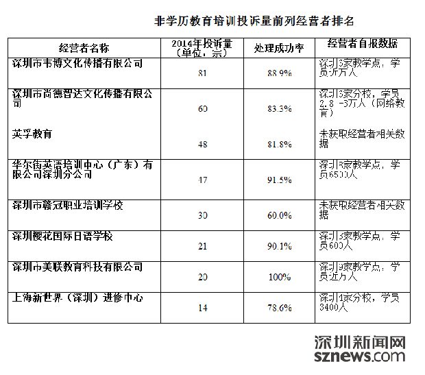 在市消委会公布的非学历教育培训投诉量前列的8家机构中,深圳市韦博文化传播有限公司投诉量81宗,排名第一,投诉处理成功率88.9%。深圳市尚德智达文化传播有限公司投诉量60宗,排名第二,处理成功率83.3%。排名第三的是英孚教育,投诉量48宗,处理成功率81.8%。