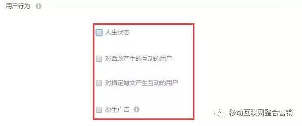 用户行为定向,基于用户的精准行为(包括生活行为、社交行为、安装行为)来定向广告的目标受众,包括人生状态(婚恋状态)、对话题产生互动的用户、对博文产生互动的用户、原生广告