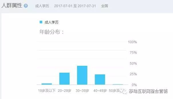 成人学历教育培训用户主要集中在20-40岁的年龄段,而且男性用户居多,根据微博用户画像来看, 2017年微博用户人群属性青年白领群体是微博用户的主力群体,30岁以下青年群体作为微博的主要用户,占比达到80%以上;18-30岁用户占比接近70%