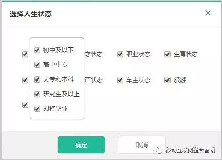 人生状态定向对于学历教育培训行业来说非常重要。下图中就是目前全部的人生状态定向了。可以看到包括求学阶段,求学阶段又可以看到详细的学历分段,有助于锁定有学历提升需求的目标用户