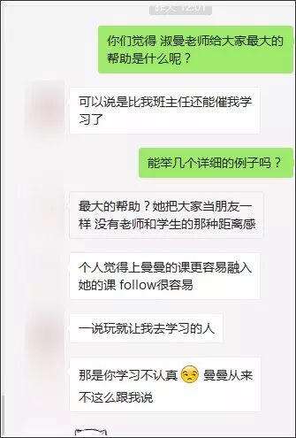 在群里,她与学员之间就像是认识了很久的朋友一样,而事实上有些学员她接触才不过几个月的时间。“淑曼老师有没有做过哪些令你们印象深刻的事情呢?”“她把大家当朋友一样,”“她的课很容易跟上”,“一说玩就让我去学习的人”------所有人都好像在自己心里有一个淑曼老师的形象,她们都亲切地称呼她为“曼曼”。