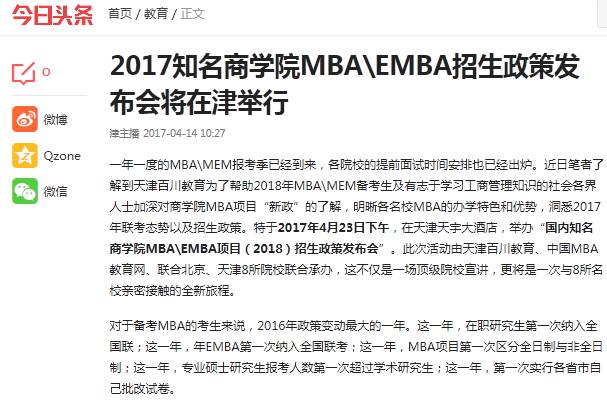 一年一度的MBA\MEM报考季已经到来,各院校的提前面试时间安排也已经出炉,为了加深2018年MBA\MEM备考生及有志于学习工商管理知识的社会各界人士对商学院MBA项目“新政”的了解,明晰各名校MBA的办学特色和优势,洞悉2018年联考态势以及招生政策。2017年4月23日,天津百川教育、中国MBA教育网将联合北京、天津9所院校,联合承办“国内知名商学院MBA\EMBA项目(2018)招生政策发布会”。这不仅是一场顶级院校宣讲,更将是一次与9所名校亲密接触的全新旅程。